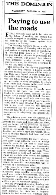 The editorial of The Dominion 15 October 1997 reports that full user pays is on its way, following the report of the Roading Advisory Group (RAG). The RAG conclusions were that the system needed more than minor reforms, nor should it simply have more money spent on it, but also it did not support privatising the roads. It recommended retaining open access to roads but with user pays. It included ending ratepayer funding for roads, but retaining ratepayer funding of footpaths and cycleways. The editorial mentioned the use of technology to enable road pricing, but also called for an end to direction of some fuel taxes to the Crown account.